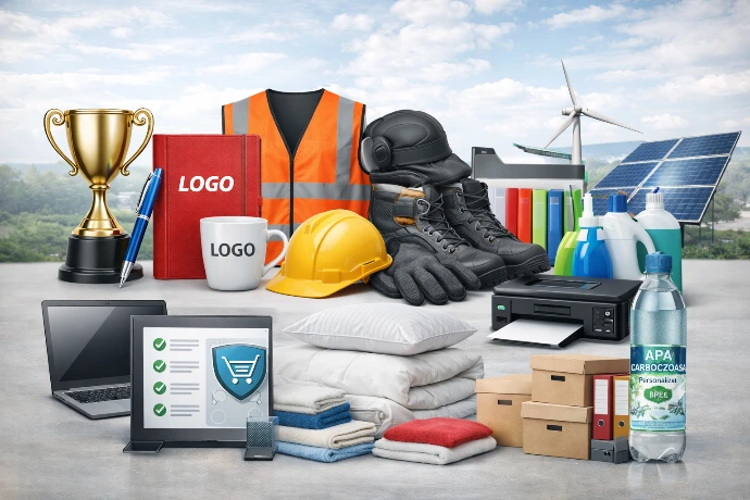 Oferim acces rapid la o gamă extinsă de produse profesionale: echipamente de lucru, textile personalizate, materiale promoționale, consumabile, soluții logistice și produse pentru spații comerciale și industriale. Gestionăm centralizat comenzile pentru a reduce timpul de coordonare și costurile operaționale ale clienților.